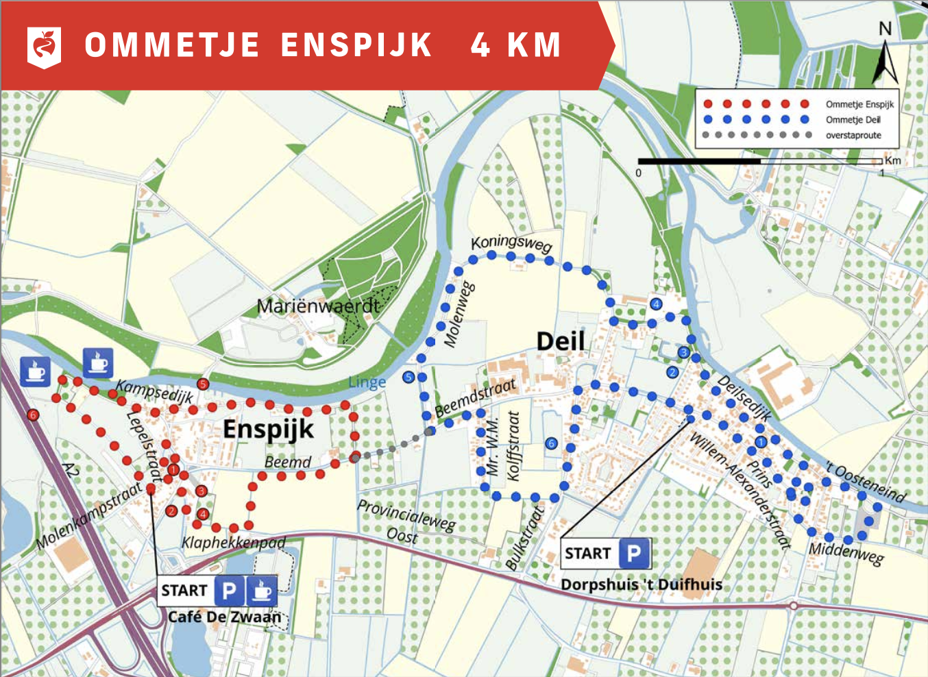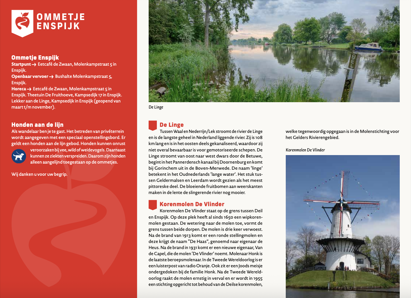 Op 4 oktober opent de wethouder het ommetje Enspijk dat samen met de stichting Landschapsbeheer Gelderland en een werkgroep bestaand uit inwoners van Deil en Enspijk is ontwikkeld. Ontdek tijdens het Ommetje het mooie landschap rondom Enspijk met oude dijken en boomgaarden. De route kan worden verlengd tot 9 km door het te combineren met het Ommetje Deil. Dit staat op de kaart aangegeven en is onderweg gemarkeerd.